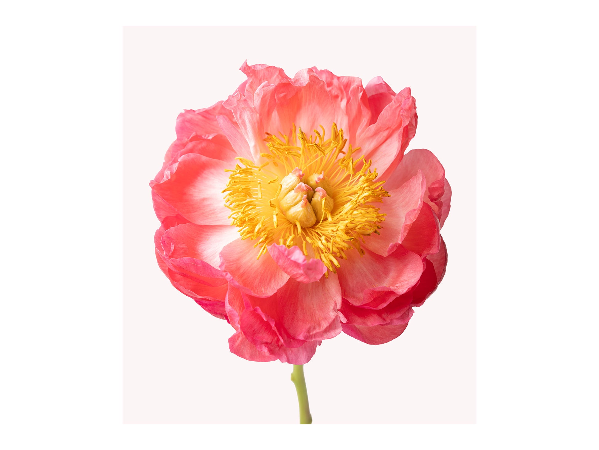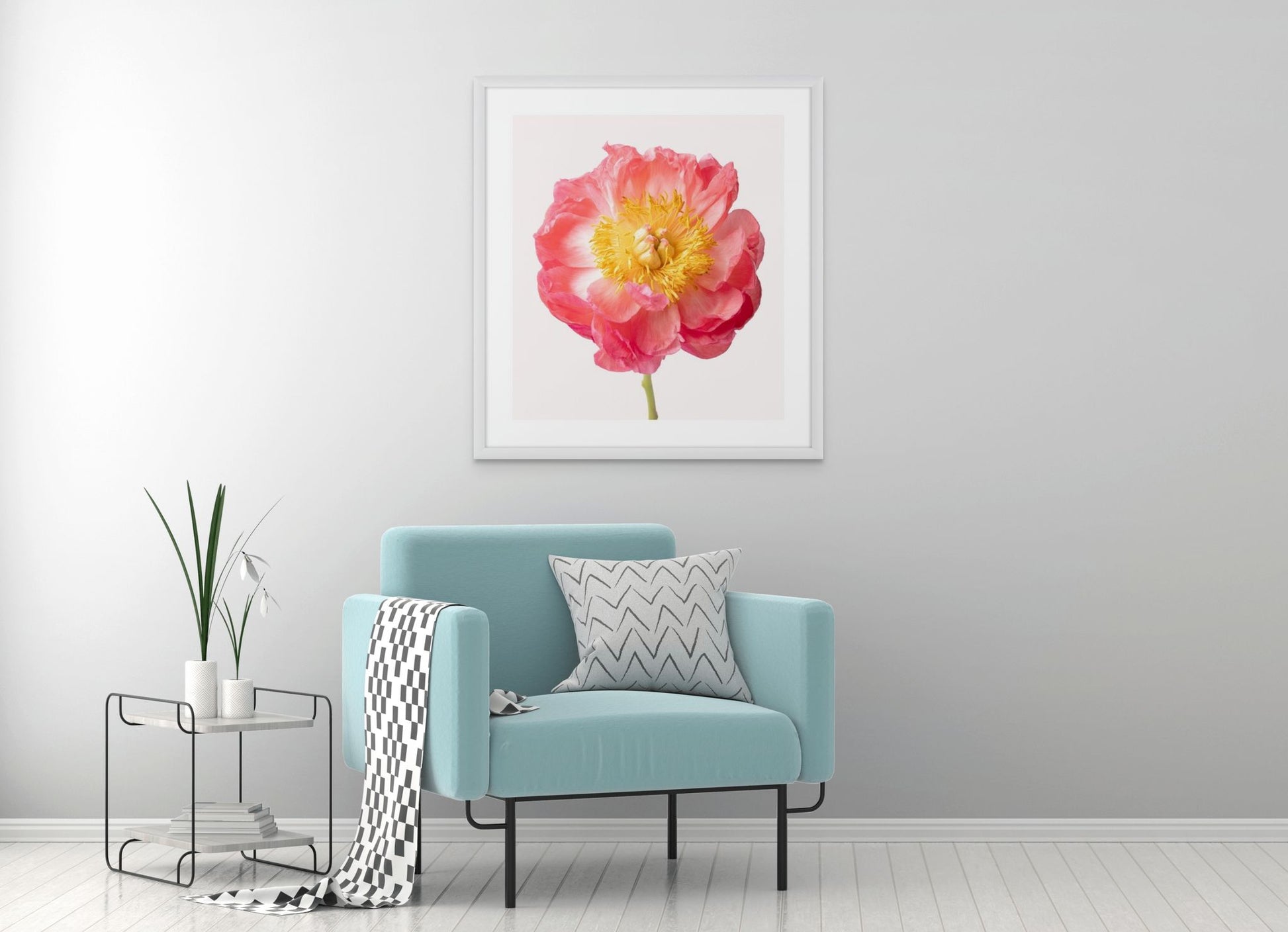 JoJo is a bright pink peony captured in full bloom. Set against a crisp white background, this vertical floral print adds a clean, contemporary touch to any space. A fresh take on botanical wall art — bold, elegant, and joyfully modern.